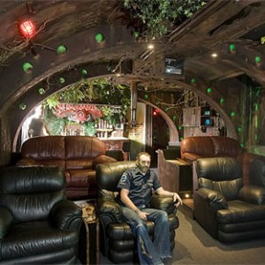Themed props enable the home owner to escape into a 20,000 Leagues Under the Sea adventure. There’s an iris viewport like Captain Nemo used to for underwater viewing, an intercom box, navigation gauges, and Captain Nemo’s underwater rifle. The projector was designed to resemble the Magic Lantern. Ceiling beams were added to help give that Nautilus feel.