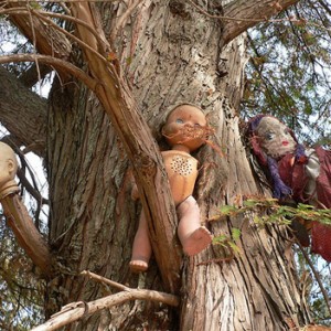 One doll in a tree, however, was not enough to ease Santana’s troubled mind. He continued to fish dolls and doll parts out of the canal whenever he saw them, hanging each one carefully on the island. There weren’t enough canal dolls to satisfy Santana’s tortured spirit, so he began scavenging more from trash heaps on his rare trips away from home. Later in life, he began trading his home-grown fruits and vegetables for dolls.