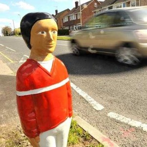Leicester City Council faced a conundrum in early 2014: children walking to and from Whitehall Primary school were endangered by vehicular road traffic. The street had no sidewalks; only a row of metal traffic bollards. The council’s ingenious solution was to modify the bollards to look like children, many wearing the school’s red uniforms. Kudos to Flickr user KiranParmar for capturing these kinda creepy “Stepford Children” in their native habitat.