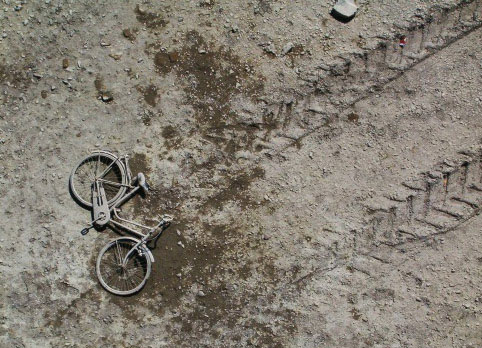 Who deserts their bicycle on the beach, leaving it to blend in with the mud-colored surroundings? The tracks suggest someone did just that, though perhaps it simply somehow washed ashore. (Source)