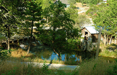 This deserted dam and the associated dilapidated mill structure are long-abandoned remnants of what was once a childrens’ theme park. However, despite age and wear the dam still holds water. (Source)