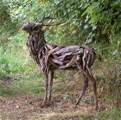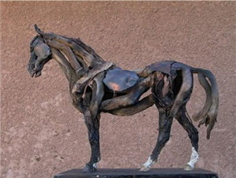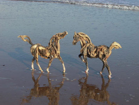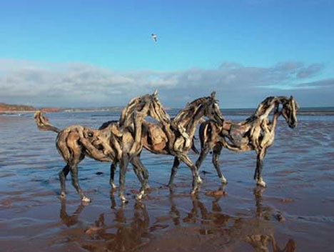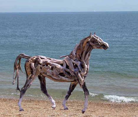 Heather Jansch’s driftwood sculptures feature a variety of animals, but the most abundant and notable subjects are horses. The artist has had a life-long love of horses, and it shows in the incredible detail she puts into her life-size horse sculptures. The magnificent figures are so lifelike and full of energy that they seem likely to spring into movement at any moment. Her work isn’t limited solely to horses and driftwood, however. She also sculpts other animals from driftwood and casts some of her sculptures in bronze.