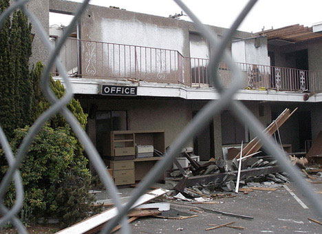 One would be hard pressed to identify this as any kind of office if it weren’t for the sign – one of few things still hanging attached to this relatively distressed structure. The office was probably for the manager of this residential complex but the contents have clearly been stripped of everything useful since the desertion of the building.