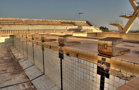 Yet another strange kind of abandonment. What, after all, does one do with a giant swimming pool no longer being used for swimming? Their fairly single-purpose design is difficult to adaptively reuse as anything but a skateboard park. However, apparently some locals at this pool near the Modibo Keita stadium have actually taken up residence in the former changing rooms! (Source)