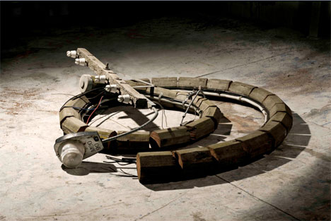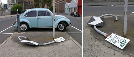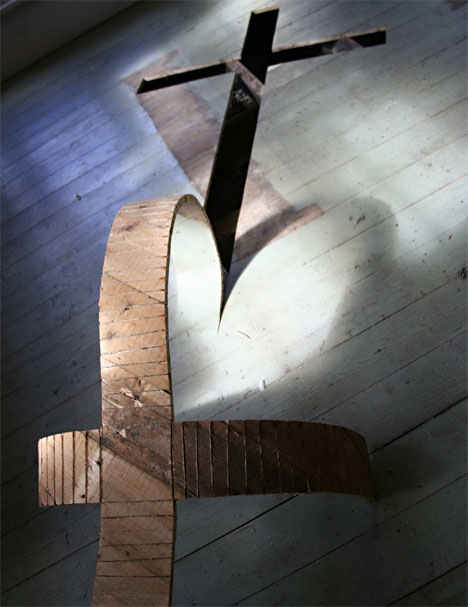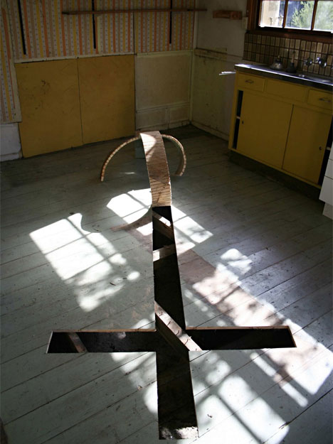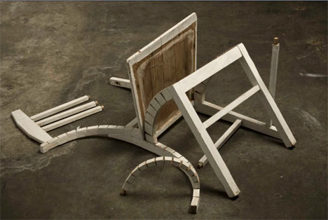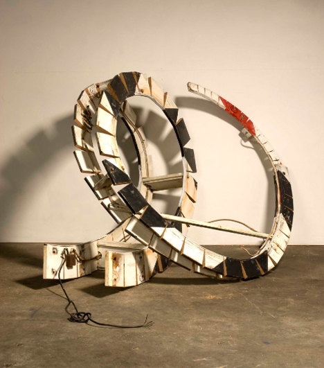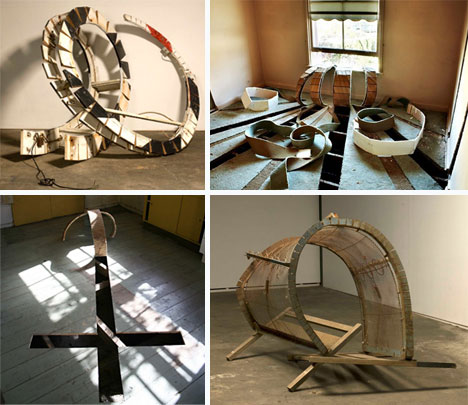 According to the artist, his goal is to call attention to the impermanence of the things that we surround and comfort ourselves with. “In my work I transform material from the urban environment using simple processes of cutting, bending and stacking. Arranging and reconstructing the portions I search for discernable patterns to create new forms that intercept the preconceived order. Offering up the potential of a new process of thought or interaction.” Click to enlarge: