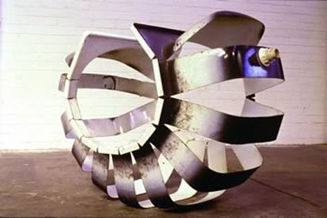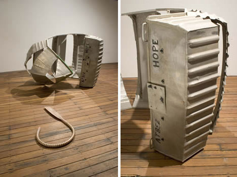Rowlands’ art is characterized by the distorted shapes of familiar and semi-familiar objects. From coiled crutches to deconstructed bathtubs to entire rooms missing orange peel-type segments, his work forces the viewer to take a momentary step back from familiarity.