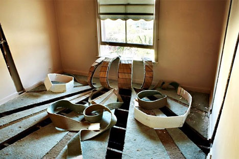 If you set most artists loose in a building that was about to be demolished, you might get some unforgettable results. You’d no doubt see plenty of new paintings on the walls, some slice-of-life installations, and maybe even a gravity-defying upside-down room setting. But turn sculptor Robbie Rowlands loose in an abandoned building, and the building itself becomes art in a most peculiar way.