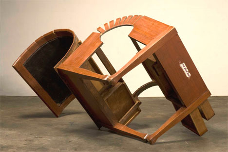 “The Offering.” This repurposed desk speaks on a basic level to those of us who have completely rearranged our lives in the name of love. The solid construction has been broken down so that the seemingly immobile materials could be coaxed into an entirely new form.