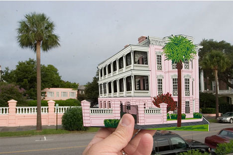 This photograph depicts a wooden postcard replacing a period house in Charleston, South Carolina. The perspective of the photograph is carefully arranged to perfectly match the perspective of the postcard.