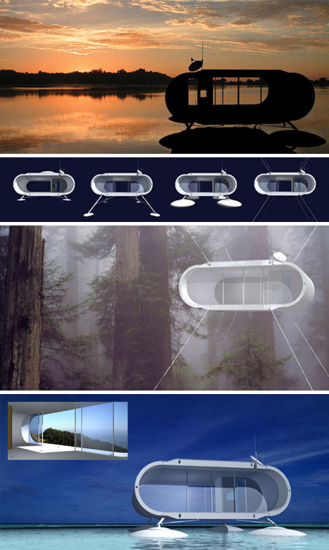 The so-called Life Pod looks like anything but a last resort. If anything, it looks rather like an exotic micro-resort. It is equipped with transformable feet that allow it to adapt to various surface conditions or even be suspended in mid-air to minimally impact the surrounding environment – a literal way to lower the eco-footprint of the structure. Minimalist inside and out, the super-strong structure uses state-of-the-art engineering for maximum durability, in turn increasing its sustainability. (Source)