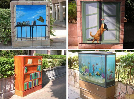 Why not take an ordinary dull and drab piece of forgotten urban furniture and make it into a work of art? Some artists have done just that with a variety of playful motifs that fit the scale of a circuit box – from a window or bookshelf to a fish-filled aquarium.