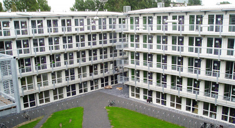 Diemen, near Amsterdam, suffers from a lack of affordable student housing. Tempohousing designed and built this 5-story, 250-unit housing area for students. It took about 12 weeks to assemble all of the units after they arrived.