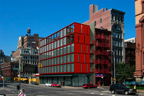 Bright red shipping containers contrast with brick historical buildings on Lafayette Street in New York City. Designed by Urban Space Management, this concept was proposed to add office space to the block, but it’s not clear whether it will ever actually be built.